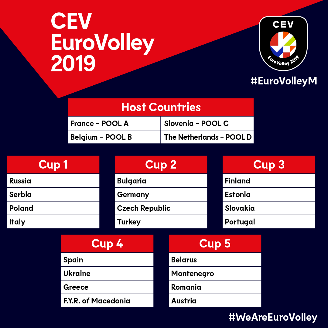 Organizatorice evropskega prvenstva, Francija, Slovenija, Nizozemska in Belgija, so že razdeljene v štiri bobne, CEV je preostalih 20 reprezentanc razdelila v pet kakovostnih bobnov. Udeležbo na EuroVolleyju 2019 si je poleg osmih najboljših moštev z zadnjega prvenstva, leta 2017, zagotovilo še dvanajst reprezentanc, ki so se na EP 2019 uvrstile prek kvalifikacij.