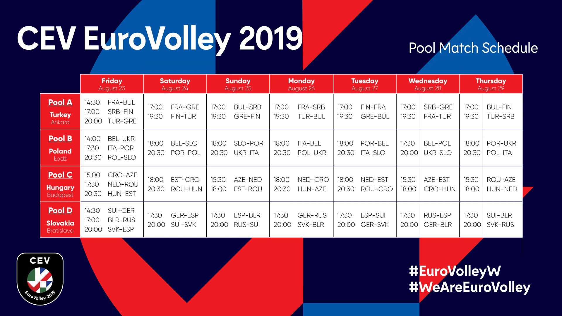 Evropska odbojkarska zveza je objavila končni razpored tekem evropskega prvenstva za ženske, ki ga bodo od 23. avgusta do 8. septembra gostile Turčija, Poljska, Madžarska in Slovaška. Naša dekleta bodo prvi obračun v Lodžu igrala v večernem terminu, proti gostiteljici, Poljski.