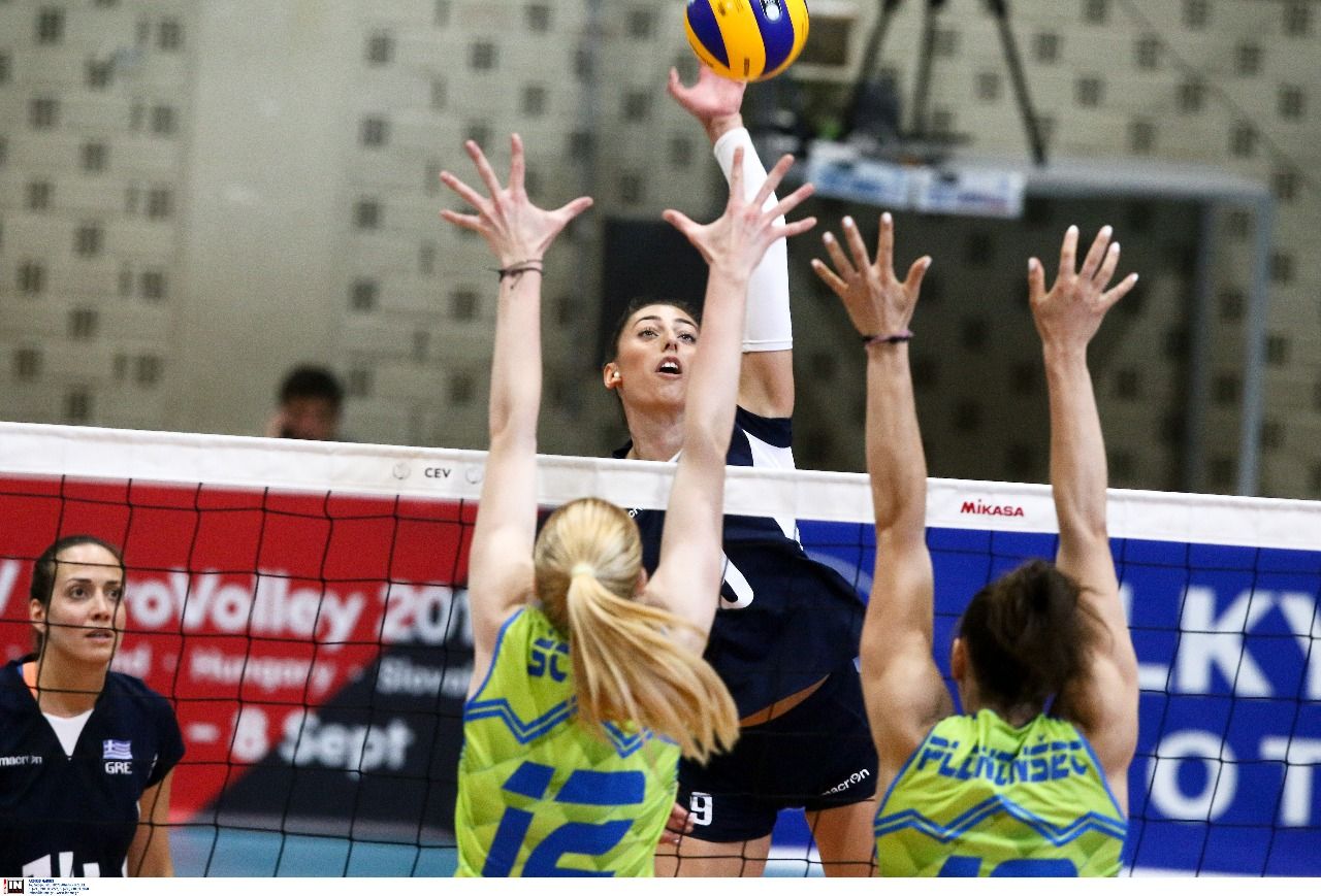 Naša dekleta so tekmo odprla z vodstvom s 4:1 in grškega stratega Guillerma Hernandeza prisilila v prvo prekinitev. Po njej je točki z napadom in začetnim udarcem prispevala Planinščeva. Grkinje so se nato približale na 5:7, a sta Grudina in Zdovc Sporerjeva poskrbeli za dve zaporedni točki za 9:5. Na začetni udarec Grudine so Slovenke, tudi prek napadov Ščuke in Erženove, prišle do nove serije in šestih točk naskoka (12:6). Potem, ko so gostiteljice z dobrimi protinapadi razliko stopile na tri točke, na 13:16, je po odmoru posegel Chiappini, ki je pri 15:18 na sprejem poslal Anito Sobočan. Z varanjem Morijeve in blokom Ščuke so naše pobegnile na 20:15, a je Maria Oikonomidou z napadom in odličnimi začetnimi udarci svoje moštvo vrnila v igro (18:20). V zaključku niza so naše ostale zbrane in se po uspešnem napadu Erženove veselile zmage s 25:19.