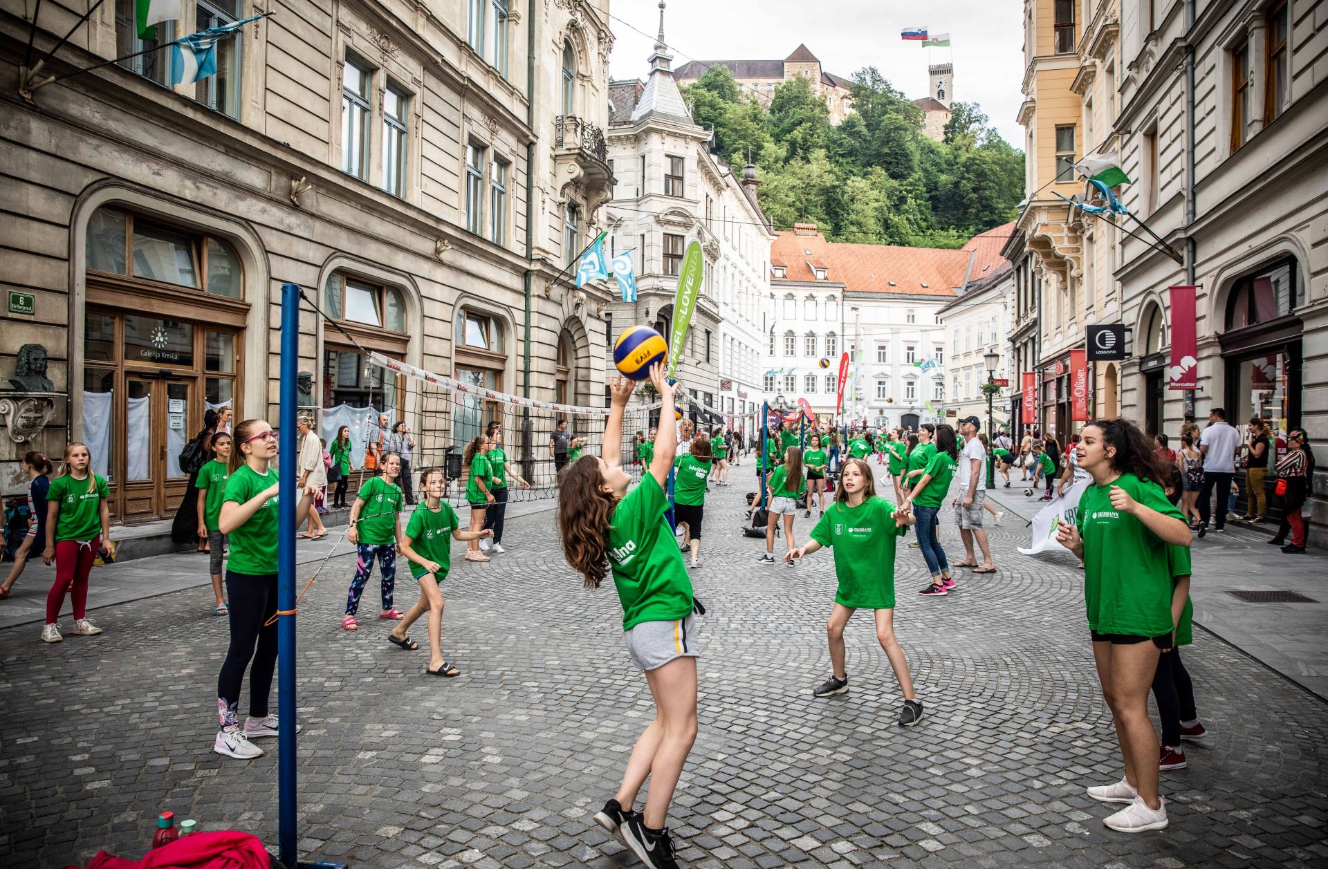 Odbojkarska zveza Slovenije (OZS) je v okviru priprav na septembrsko evropsko prvenstvo za moške danes v središču Ljubljane izpeljala prireditev, ki je obeležila 99 dni do začetka prvenstva, hkrati pa se je pred Mestno hišo zableščal povsem nov pokal za evropskega prvaka.