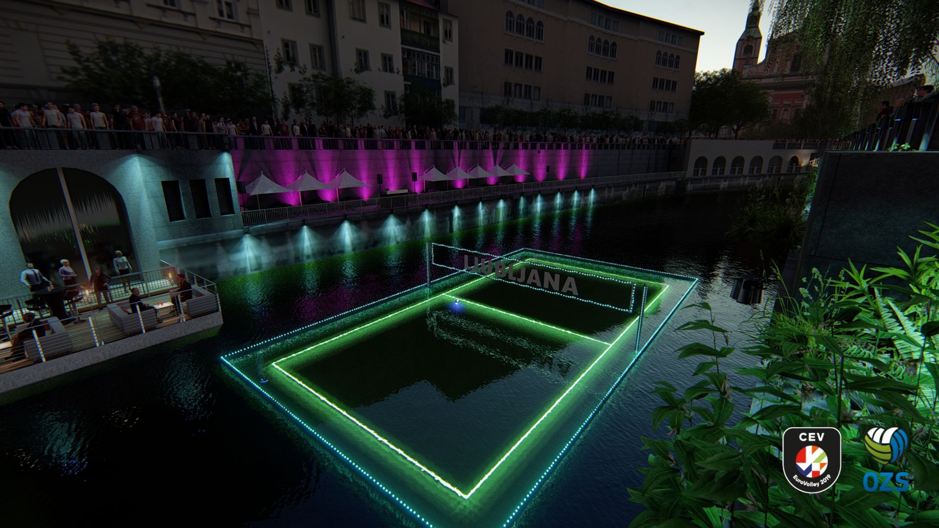 Pod Ribjo brvjo pri lokalu Makalonca v neposredni bližini Tromostovja bomo z rečnega nabrežja spremljali tekmo med svetovnimi odbojkarskimi zvezdniki, ki bo potekala na plavajočem igrišču sredi Ljubljanice. Igralna površina bo obrobljena s svetlečimi črtami, ki bodo označevale igralno polje, večerna atmosfera pa bo gledalcem dala občutek, da odbojkarje spremljajo, medtem ko se ti premikajo tik nad vodno gladino.
