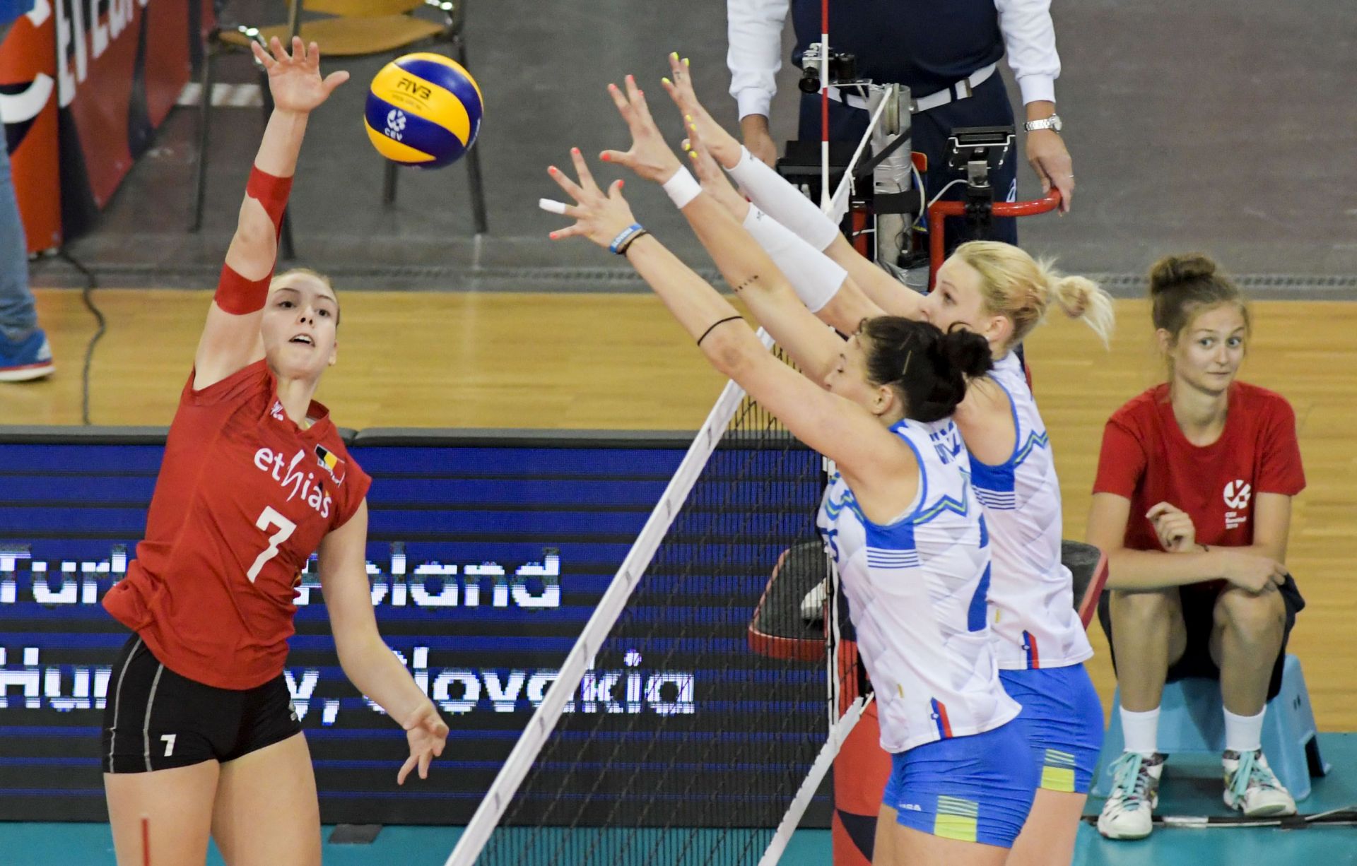 Slovenska izbrana vrsta je obračun proti Belgiji, ki je prvenstvo odprla z zmago nad Ukrajino, začela v enaki zasedbi kot proti Poljski, z Evo Mori, Izo Mlakar, Sašo Planinšec, Tino Grudina, Lano Ščuka, Ano Marijo Vovk in Veroniko Mikl. V uvodu v prvi niz se je v našo ekipo prikradla nervoza, vrstile so se napake, tekmice pa so to s pridom izkoristile ter pri vodstvu s 6:2 našega stratega Alessandra Chiappinija prisilile v prekinitev. Celine van Gestel in Marlies Janssens sta z neugodnimi začetnimi udarci izvajali pritisk na naše sprejemalke, Slovenke niso prihajale do zaključkov, prednost Belgijk je rastla. Pri zaostanku s 4:12 je slovenska klop še enkrat poizkusila z odmorom, a se razmerje moči ni spremenilo. Varovanke Gerta van de Broeka so nizale točko za točko in v končnico vstopile z 20:11. Niz so prepričljivo, s 25:13 dobile tekmice.