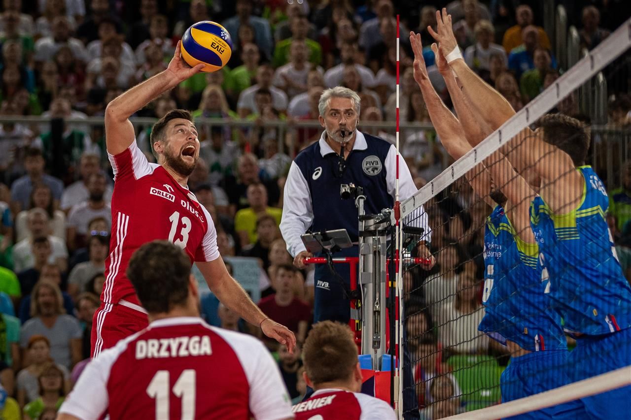 Slovenija je polfinalno srečanje proti Poljski začela v udarni postavi Dejan Vinčić, Mitja Gasparini, Alen Pajenk, Jan Kozamernik, Klemen Čebulj, kapetan Tine Urnaut in Jani Kovačič na mestu prostega igralca. Uvodni točki v Stožicah sta pripadli Poljakom, ki so tudi v nadaljevanju narekovali ritem igre. Sledilo je še nekaj napak na slovenski strani mreže in nasprotniki so povedli za štiri točke, zato je strateg naše izbrane vrste Alberto Giuliani zahteval premor. Tudi po prekinitvi so Poljaki nadaljevali z močnimi začetnimi udarci. Leon je tako dosegel naslednjo točko, nato pa je Gasparini z uspešnim napadom le prekinil poljski niz. Ob glasni podpori s tribun razprodane Arene Stožice je sledila serija dobrih začetnih udarcev Urnauta in Slovenci so se približali le na točko zaostanka, z napadom Kozamernika pa izenačili na 9. točki. Poljaki so zopet pobegnili za nekaj točk, a so naši odbojkarji ujeli priključek (17-18). Po dveh zaporednih točkah Poljske je namesto Gasparinija na igrišče stopil Tonček Štern, novo točko pa je Sloveniji z zvitim napadom prinesel Čebulj, ki je bil glavna tarča poljskih serverjev. Slovenci so tudi v končnici ostali zbrani in z blokom poravnali rezultat na 22:22. Po uspešnem napadu je Čebulj s točko neposredno z začetnim udarcem priboril domačinom prvo zaključno žogo, a so se Poljaki preko Wilfreda Leona v prvo še uspeli ubraniti, Pajenk pa je z izjemnim blokom Sloveniji priboril prvi niz.