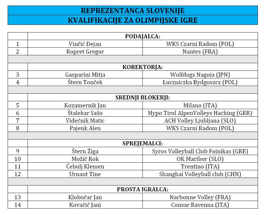 Izbrana vrsta se bo na pripravah zbrala 27. decembra v Ljubljani, kjer bodo Slovenci odigrali tudi tri pripravljalne tekme z Nizozemsko, Alberto Giuliani pa računa na štirinajst odbojkarjev z najnovejšega seznama. Na njem zaradi poškodbe kolena ni sprejemalca Alena Šketa, ki ga bo nadomestil sedemnajstletni odbojkar Maribora, Rok Možič, sicer pa sprememb v kadru reprezentance v primerjavi z EuroVolleyjem ni.