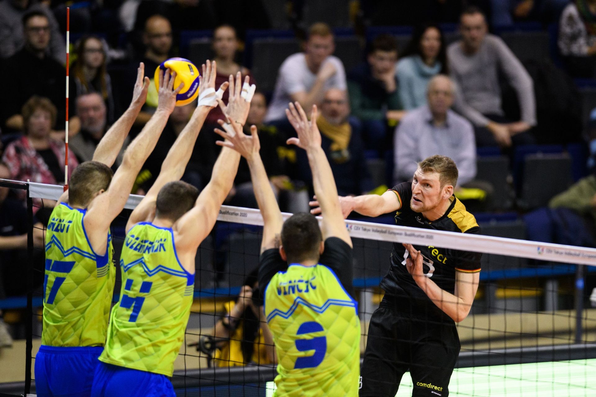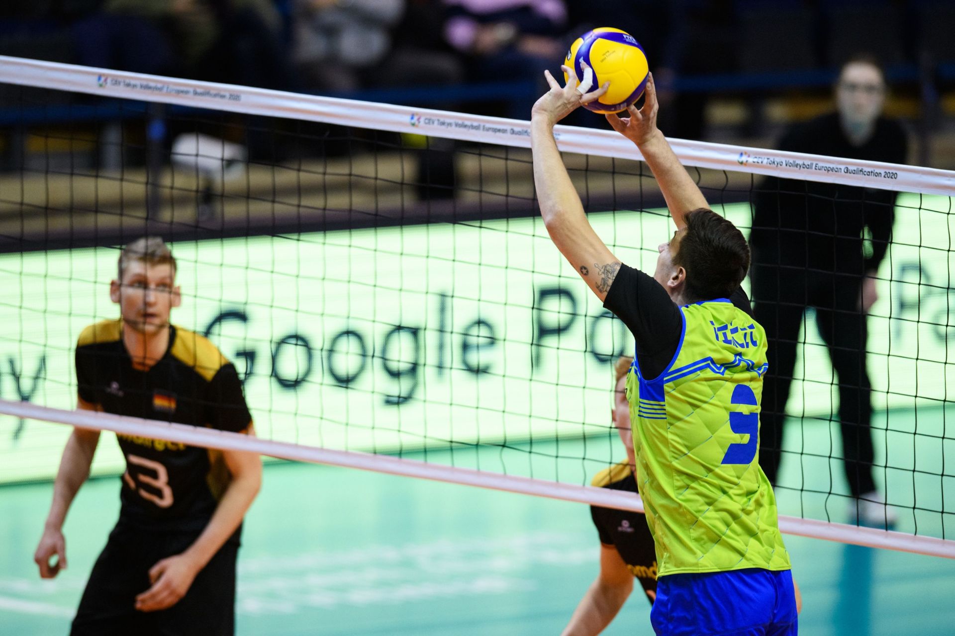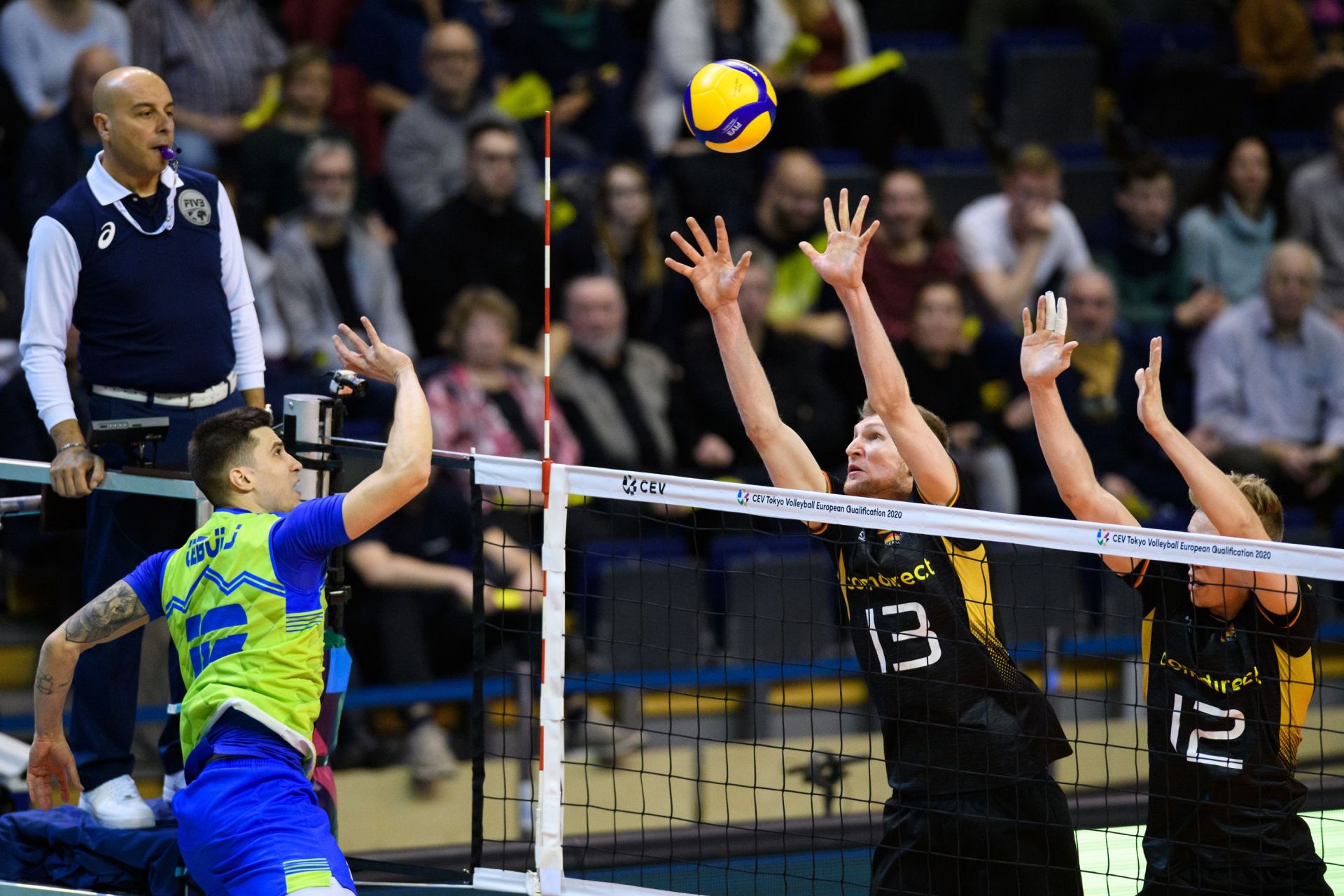Slovenski selektor Alberto Giuliani je v ogenj proti Nemčiji poslal enako zasedbo kot že na prvi tekmi z Nizozemsko, podajalca Dejana Vinčića, korektorja Tončka Šterna, srednja blokerja Alena Pajenka in Jana Kozmernika, sprejemalca Klemna Čebulja in Tineta Urnauta ter prostega igralca Janija Kovačiča. Nemci, ki so doslej dobili obračuna proti Češki in Belgiji. Nemški selektor Andrea Giani pa tokrat ni mogel računati na poškodovanega Györgyja Grozerja, ki pa bo do polfinala že pripravljen za igro.