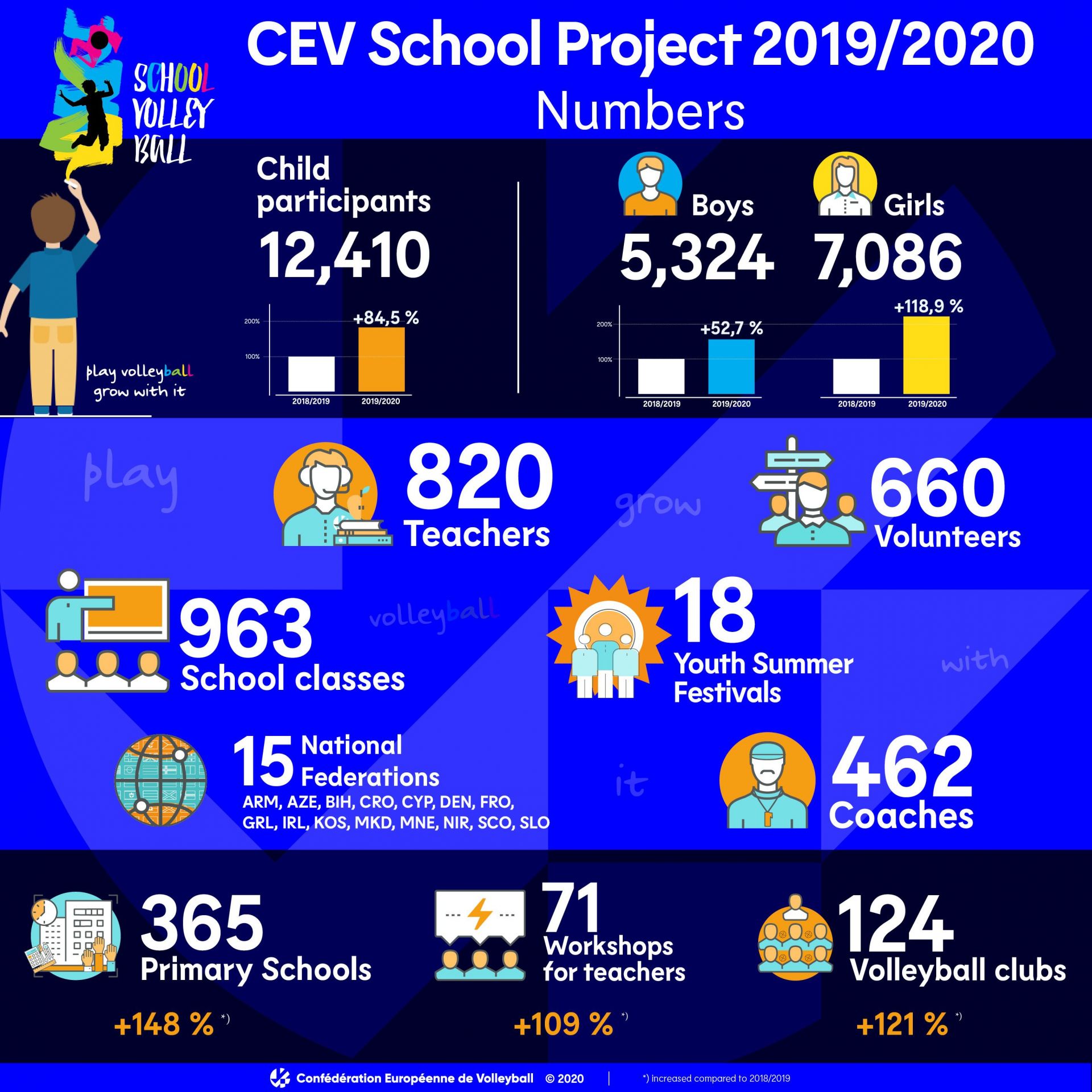 Z zaključkom šolskega leta je CEV objavil rezultate letošnjega projekta CEV School Project, ki za zdaj poteka v 15 državah, ob Sloveniji še v Armeniji, Azerbajdžanu, Bosni in Hercegovini, na Hrvaškem, Cipru, Danskem, Ferskih otokih, Grenlandiji, Irskem, Kosovu, v Severni Makedoniji, Črni Gori, na Severnem Irskem in Škotskem. Število otrok, ki so vključeni v projekt, se je v zadnjem letu povečalo za kar 84,5 %, na skupno 12.410 udeležencev. Od tega se je število deklet, ki se v okviru šolskih dejavnosti ukvarjajo z odbojko, nekaj več kot 7000 oziroma 119 % več kot leto prej, pri dečkih se je število povečalo za skoraj 53 %.