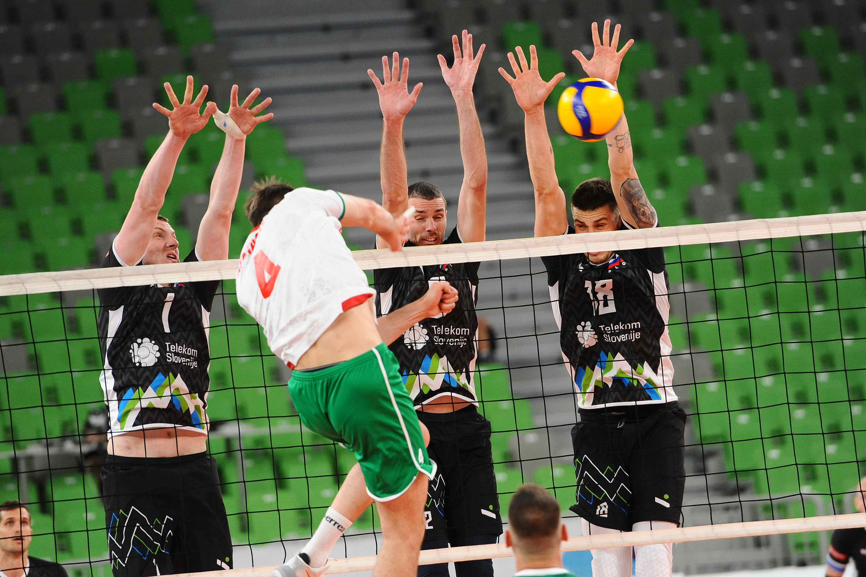 V Areni Stožice smo spremljali izenačen začetek turnirja, ekipi sta izmenično dosegali točke in bili poravnani na 4:4. Na začetni udarec Sokolova so gostje prišli do treh zaporednih točk ter slovenskega selektorja Alberta Giulianija prisilili v odmor. Po njem so Bolgari grešili, točki Tončka Šterna in Štalekarja v napadu pa sta Sloveniji zagotovili izenačenje na 10:10. Čebulj je Slovenijo povedel v vodstvo s 13:12. Sledil je nov preobrat, Seganov je izkoristil nezbranost naših za točko za 17:15. Bolgari so ostajali v ospredju in v končnico vstopili z minimalno prednostjo (20:19) ter po napaki naših v napadu vodili z 22:20. Po novem izenačenju, tokrat na 22:22, sta sledili še dve zaporedni napaki Slovencev, Giuliani je vzel odmor. Pajenk je izničil prvo zaključno žogo, Sokolov pa je zatem zaključil napad za zmago s 25:23.