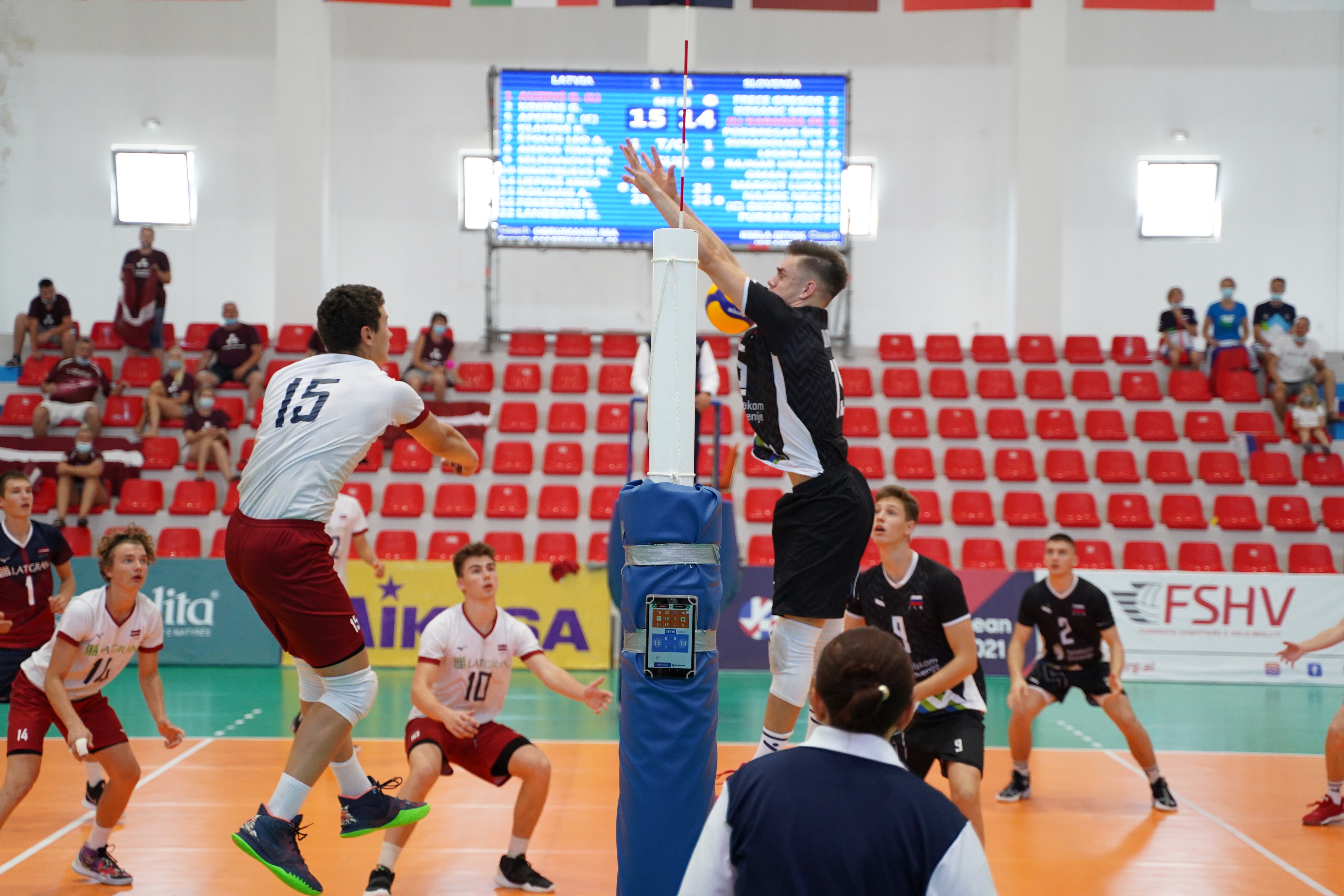 Slovenski odbojkarji so obračun z Latvijo začeli v nekoliko spremenjeni zasedbi, saj se je selektor Iztok Kšela odločil, da priložnost za dokazovanje ponudi še preostalim svojim varovancem. Na začetku prvega niza so pobudo prevzeli Latvijci in povedli s 5:1, a so se naši na začetni udarec Mihe Kosanca hitro približali na 5:4 ter z novim nizom točk, tokrat na servis Luke Marovta, pri 9:8 prešli v vodstvo, vodili tudi že z 12:9. Sledil je še en preobrat, predvsem po zaslugi dobrih servisov Rokjansa in protinapadov Landzansa. Latvijci so ostali v ospredju, a si vse do zaključka seta niso uspeli zagotoviti več kot točke naskoka. Slovenci so povedli z 21:20, napeta končnica pa je šla s 26:24 nato vseeno v roke tekmecem.