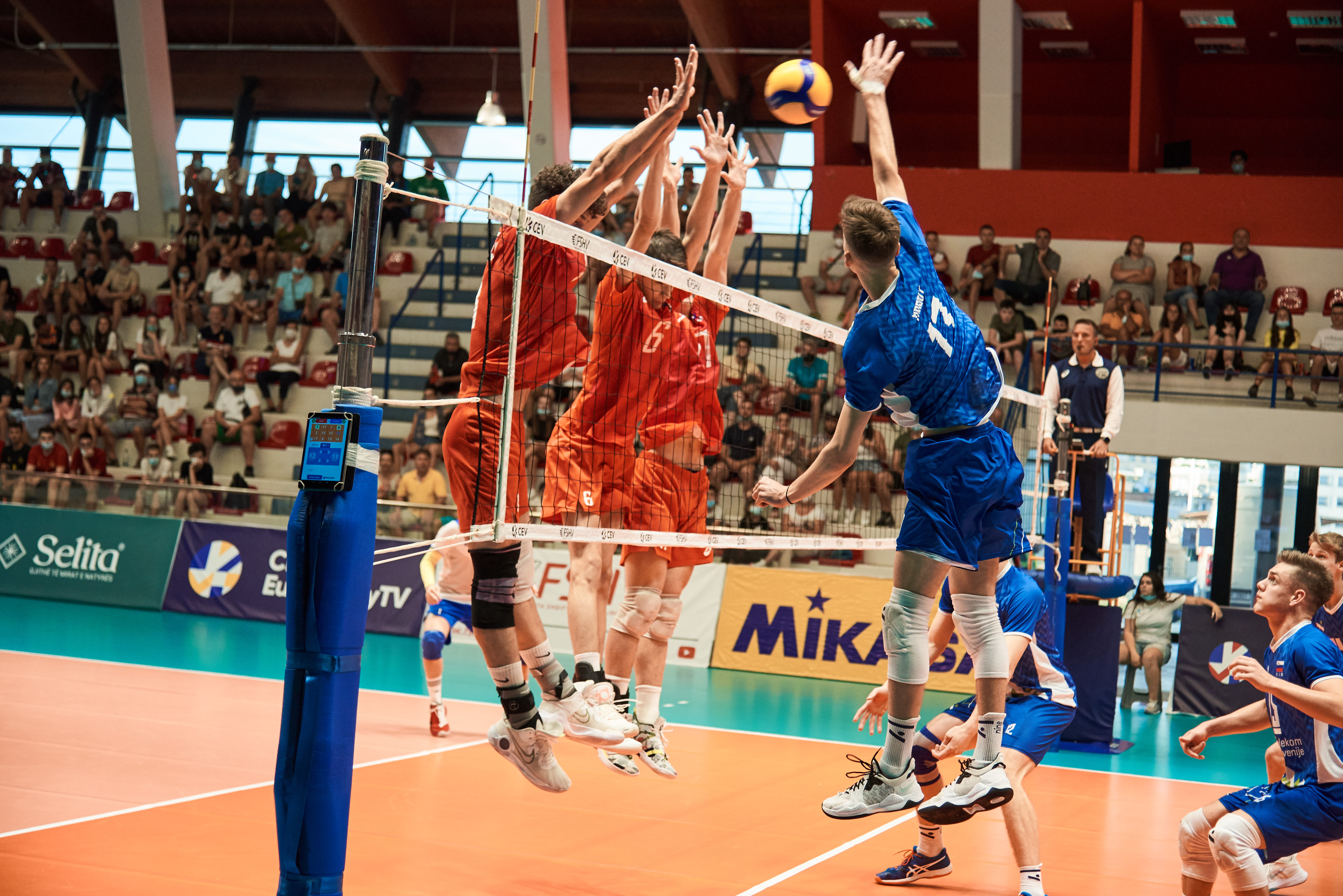 Varovanci Iztoka Kšele so v uvodu v veliki finale evropskega prvenstva do 17 let v Tirani lovili Ruse, ki so pred začetkom EuroVolleyja veljali za velike favorite in so s 3:2 slavili tudi na medsebojni tekmi skupinskega dela tekmovanja. Slovenci so nato izenačili na 4. točki, z blokom Jurija Omana pa prvič povedli s 6:5. V nadaljevanju sta ekipi izmenično osvajali točke, se tudi izmenjevali v vodstvu, nobena pa si ni uspela priigrati več kot točke naskoka. Na začetni udarec Vasilija Kapranova je Klim Piatakov z uspešnim napadom Ruse popeljal do vodstva z dvema točkama (17:15). Sledil je odgovor Mihe Okorna in Jakoba Podbregarja Špesa, Slovenci so povedli z 21:20 in si v izenačeni končnici tudi prvi priigrali zaključno žogo ter jo tudi izkoristili in slavili s 25:23.