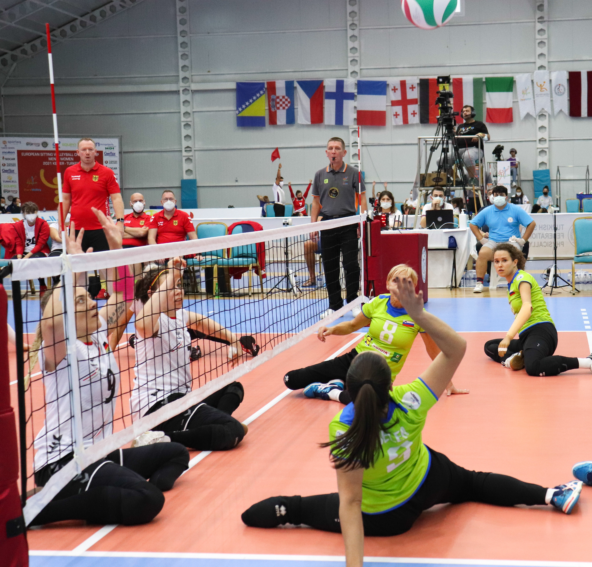 Slovenske odbojkarice so po včerajšnji zmagi nad Hrvaško na uvodni tekmi evropskega prvenstva, ki ga gosti Turčija, danes najprej zabeležile poraz proti Nemčiji, a so nato na večerni tekmi prepričljivo odpravile Turkinje. Slovenke in Nemke imajo za seboj bogato zgodovino dvobojev. Ko sta obe reprezentanci v polni zasedbi, so obračuni vselej izenačeni in na visoki ravni. Tudi prvi niz je nakazal na izjemno borbeno predstavo, ekipi sta v nizih dosegali točke in se izmenjevali v vodstvu. Na koncu so bila bolj zbrana naša dekleta, ki so se veselila zmage s 25:22. V drugem nizu se je že pokazala razlika v širini kadra, saj slovenski selektor Simon Božič v Kemerju ne more računati kar na štiri svoje varovanke. Nemke so stopnjevale ritem igre in Slovenke na ustavile na 13. točki. Tudi tretji in četrti niz sta bila povsem v domeni tekmic, ki so slavile s 25:14 in 25:9. »Na tekmo smo se precej dobro pripravili in Nemke v prvem nizu tudi presenetili. Je pa dejstvo, da je težko igrati z le šestimi igralkami, brez menjave in možnosti, da s prekinitvami ustaviš ritem tekmic, ko ti igra ne steče po željah. To se nam je zgodilo v nadaljevanju tekme, ko smo malenkost padli in ko so nam tudi nekoliko pošle moči. Sem pa vseeno zadovoljen z dobljenim nizom, ki nas je navdal z optimizmom za nadaljevanje tekmovanja,« je po tekmi dejal Božič.