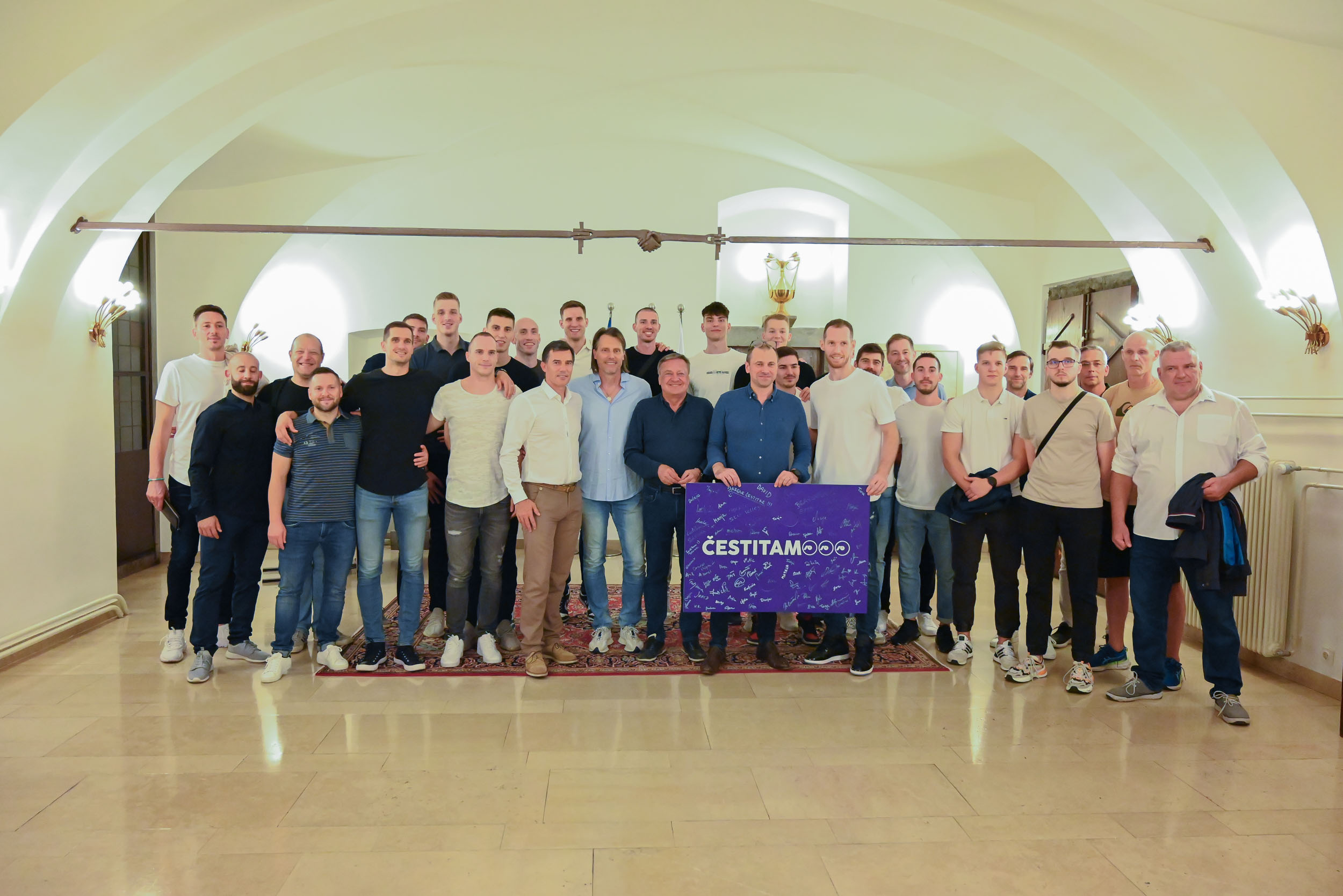 Za zaključek srede jih je v goste v Mestno hišo povabil še ljubljanski župan g. Zoran Janković. Kapetan Tine Urnaut je iz njegovih rok v imenu ekipe za novo kolajno, četrto v zgodovini, prevzel priložnostno skulpturo. Gostitelj je zbrane pozdravil in jim poleg čestitk zaželel vse dobro tudi v Tokiu. Čestitkam in lepim željam se je pridružil tudi predsednik uprave Nove Ljubljanske banke g. Blaž Brodnjak. Novo prijetno druženje se je zaključilo s skupno večerjo.
