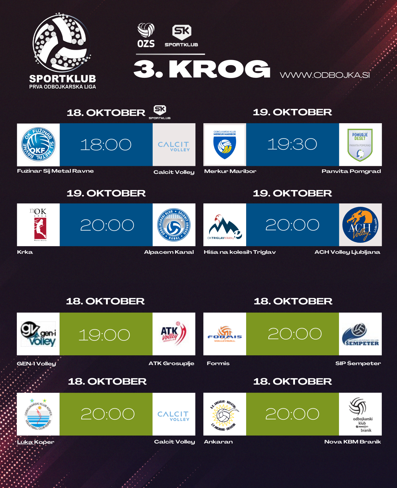Odbojkarji Fužinarja Sij Metal Ravne so se na uvodni prvenstveni tekmi zelo dobro upirali Merkur Mariboru, po porazu v gosteh pri Panviti Pomgrad pa bodo Korošci na podporo svojih zvestih navijačev lahko spet računali v sredo, ko se bodo pomerili s Calcit Volleyjem. Sobočane v četrtek čaka derbi v gosteh pri Merkur Mariboru, ki je v 2. krogu odpravil Alpacem Kanal. Slednji bo tokrat gostoval pri Krki, ki še čaka na prve točke, ekipa Hiša na kolesih Triglav pa bo v svoji dvorani gostila ACH Volley Ljubljana.