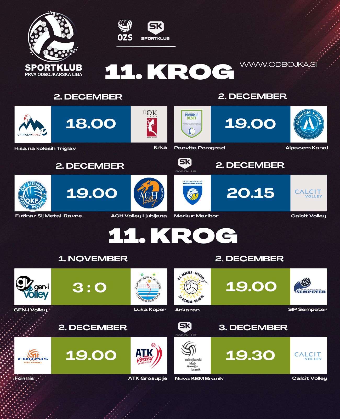 V 1B. DOL za moške bomo spremljali tekme med Calcit Volleyjem II in ATHOS-om Kostanjevico, Španom Brezovico in OK Sava ter KEKO Opremo Žužemberk in SIP Šempetrom. Srečanje med Šoštanjem Topolšico in Črnučami je predvideno za 12. december.