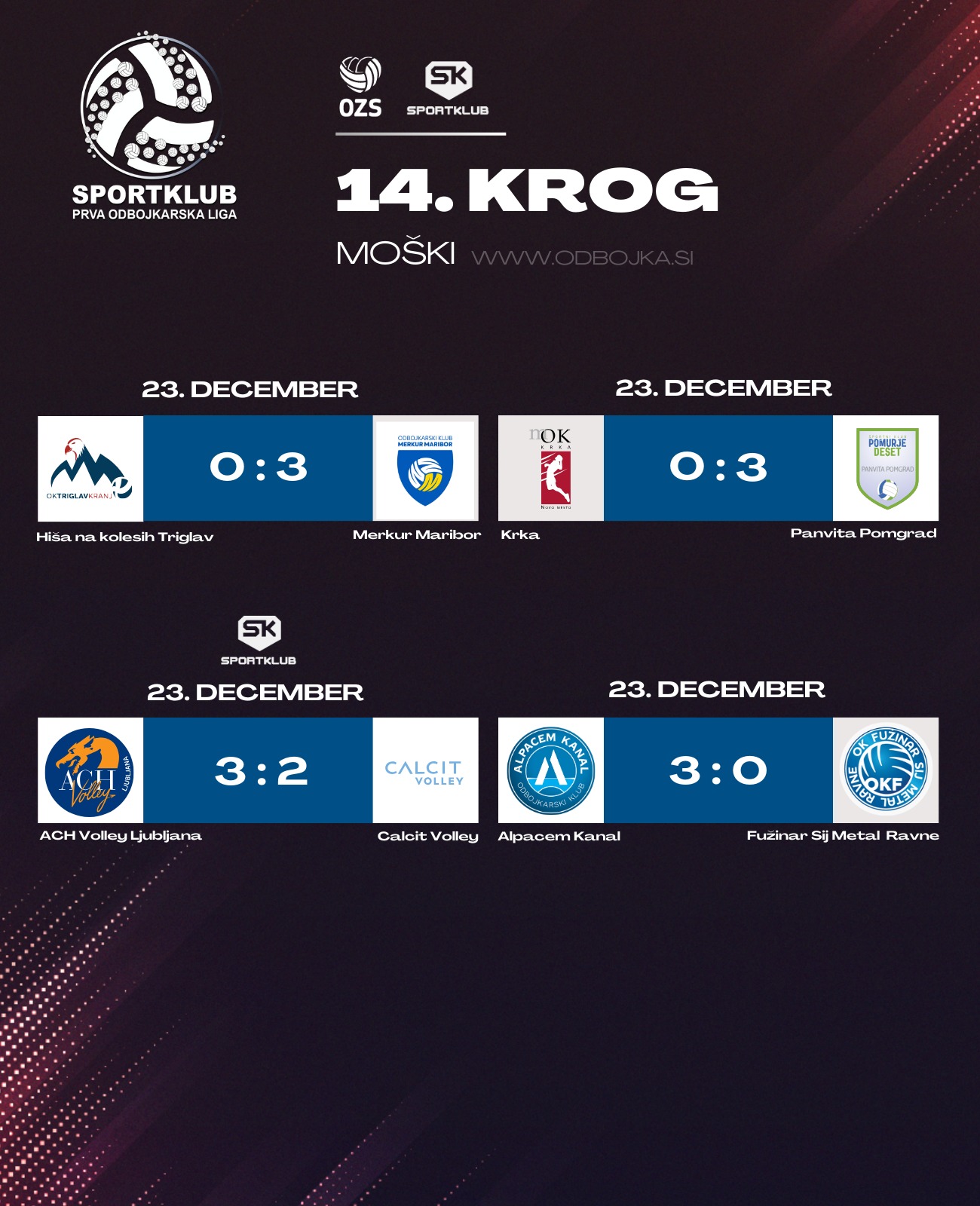V Hali Tivoli je ACH Volley v 14. krogu Sportklub 1A. DOL gostil stare znance iz Kamnika in v derbiju kroga je po več kot dveh urah napetega boja s 3:2 ljubljanska ekipa premagala Calcit Volley. Pri gostiteljih sta se s po 14 točkami izkazala Šket in Pokeršnik, Koncilja jih je dodal 12, pri Kamničanih pa je Brunet dosegel 22 točk, Mitrašinović pa 19. Da bo srečanje zelo izenačeno in napeto je pokazal že prvi niz, ki so ga oranžni zmaji dobili s 26:24. Zmagovalno točko je gostiteljem z asom priigral kapetan Gjorgiev. Ljubljančani so prišli do vodstva tudi v drugem nizu, a so Kamničani na 11. točki izenačili, nato pa igro obrnili v svojo korist ter po zaključku drugega niza 19:22, izid izenačili na 1:1. V podobnem ritmu so gostje nadaljevali tudi v tretjem nizu, ki so ga dobili z 18:25. Ljubljanska ekipa se je v četrtem nizu prebudila in znova zaigrala bolje. Prednost je naraščala, znašala tudi deset točk, pri rezultatu 20:13 pa se je obetal miren zaključek niza. Videčnik je izkoristil drugo zaključno žogo (25:18) za izid 2:2. V odločilnem nizu so domačini povedli s 5:0, a se gostje niso predali ter izenačili na 10. in 12. točki. Do zmage so po izkoriščeni drugi zaključni žogi (15:12) Šketa prišli odbojkarji ACH Volleyja.