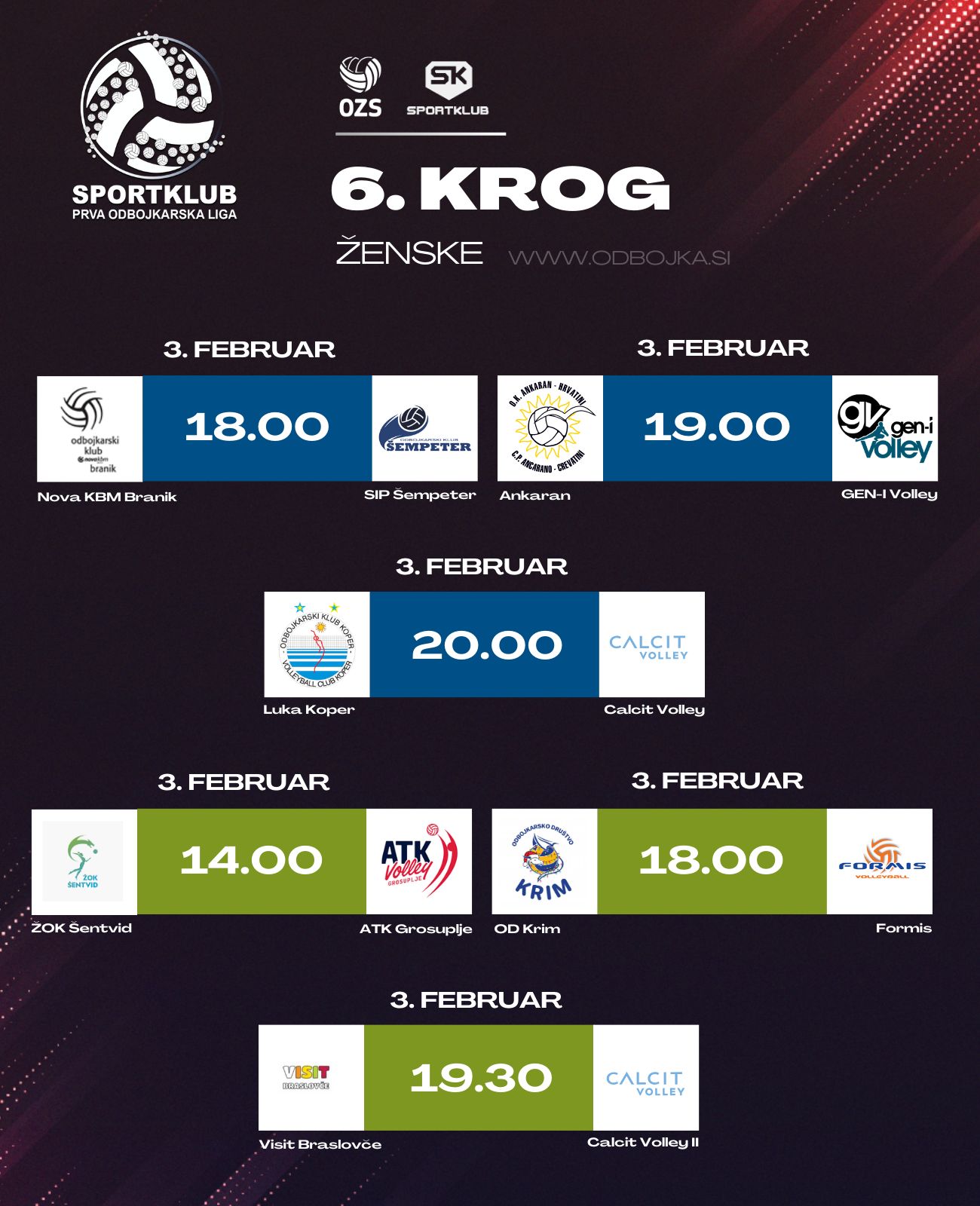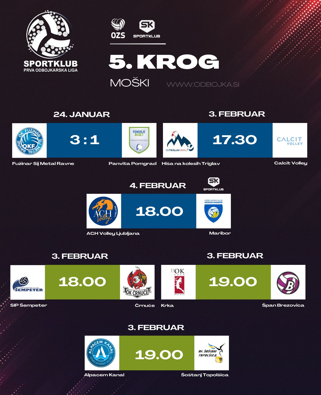 V sredo so odbojkarice in odbojkarji odigrali tekme petega oziroma četrtega kroga modre in zelene skupine v Sportklub prvi odbojkarski ligi, ta pa se nadaljuje že ta konec tedna z novimi tekmami. Tudi ta vikend prinaša zanimive pare.