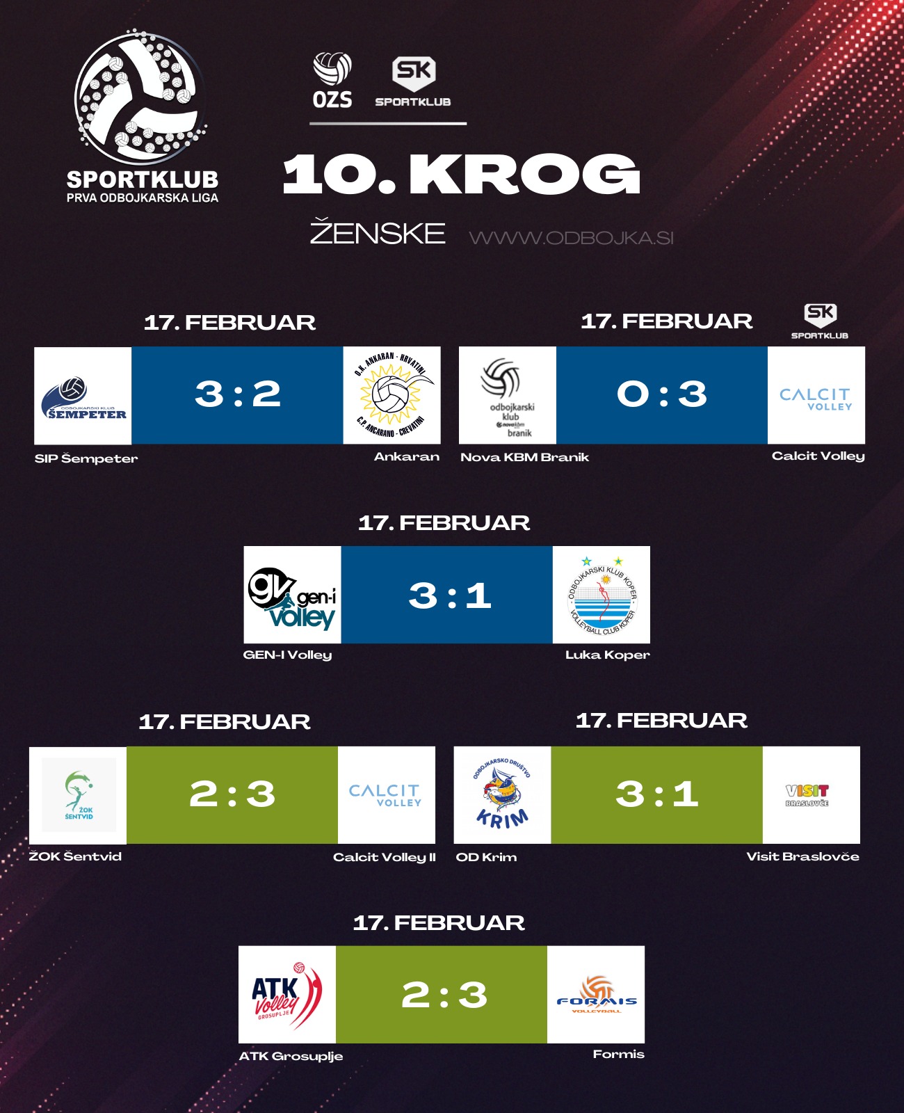 V desetem krogu zelene skupine so slavile ekipe Calcit Volley II, OD Krim in Formis, ki je po petih nizih premagal ATK Grosuplje. Ta je kljub porazu zasedel drugo mesto v zeleni skupini in bo skupaj s Calcit Volleyjem II v prihodnji sezoni igral v 1A. DOL. V Grosuplju je pri ekipi ATK gostoval hoški Formis in tekma se je končala z zmago gostij z 2:3 (-22, 18, 23, -14, -10). Podobno napeto je bilo tudi srečanje med ekipama ŽOK Šentvid in Calcit Volley II. Tudi tu so se veselile gostujoče odbojkarice, a šele po petih nizih, tekma se je končala z 2:3 (23, 16, -21, -24, -14). OD Krim pa je doma s 3:1 (19, -23, 22, 18) premagal ekipo Visit Braslovče, ki je v drugem delu prvenstva v zeleni skupini ostala brez zmage, doživela pa deset porazov.