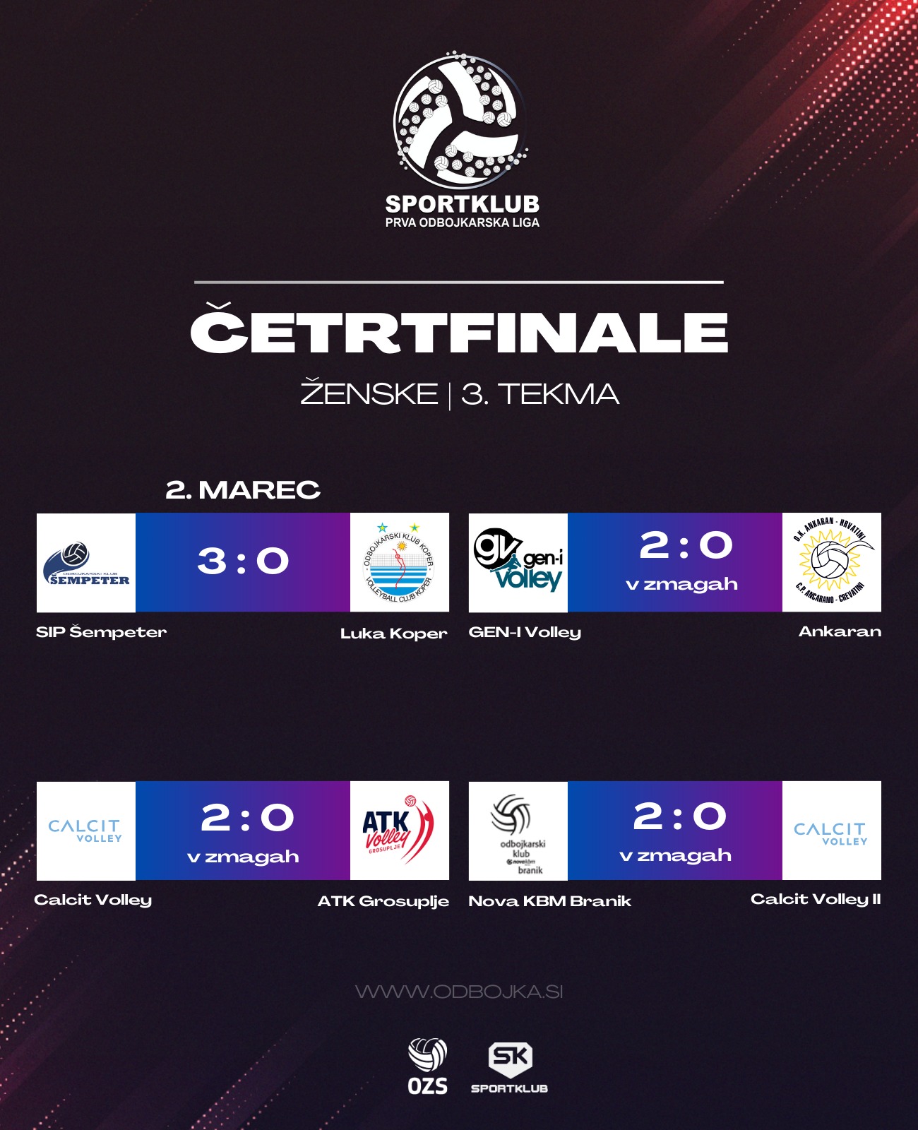 Medtem ko so si tri ekipe polfinale Sportklub prve odbojkarske lige za ženske priigrale že po dveh tekmah, to so bile Calcit Volley, Nova KBM Branik in GEN-I Volley, sta se morali ekipi SIP Šempetra in Luke Koper pomeriti še na tretji tekmi. Obe ekipi sta namreč slavili v gosteh, tretja tekma pa je potekala v Šempetru. Domačinke tokrat niso ničesar prepustile naključju in veselile so se zmage s 3:0 (23, 13, 21). V tekmo so sicer bolje vstopile gostje, ki so po dveh uspešnih napadih Khorolske povedle s 3:5. Ko je rezultat kazal 11:15 v prid Koprčank, je domači trener moral poseči že po drugem odmoru. Domačinkam je ta koristil, saj so zaostanek znižale, tako da je moral z odmorom reagirati tudi gostujoči strateg. Gostje so znova uspele priti do prednosti štirih točk (17:21), a se domačinke niso predajale in po uspešnem napadu Bulčeve in Erženove so domačinke izenačile na 23:23. Šempetranke so po zaslugi Ane Mojce Krajnc izkoristile že prvo zaključno žogo za osvojitev uvodnega niza (25:23).
