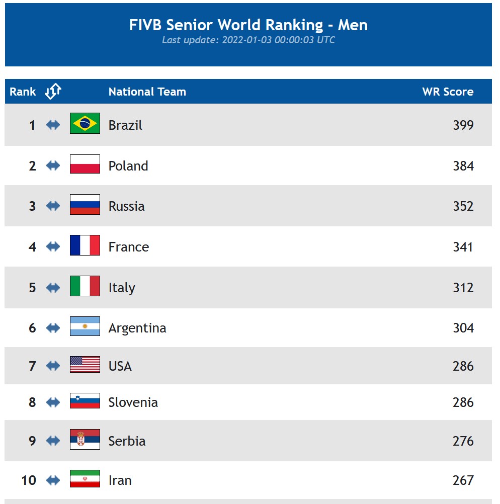 Lestvica se v času tekmovanj nenehno spreminja, za reprezentance pa je tako pomembna vsaka odigrana tekma. Slovenski odbojkarji, ki so v Ligi narodov 2021 igrali odlično in osvojili visoko 4. mesto, so si z dobrimi predstavami prvič zagotovili preboj med deseterico najuspešnejših reprezentanc, najvišje doslej pa so bili junija 2021, ko so zasedali 3. mesto.
