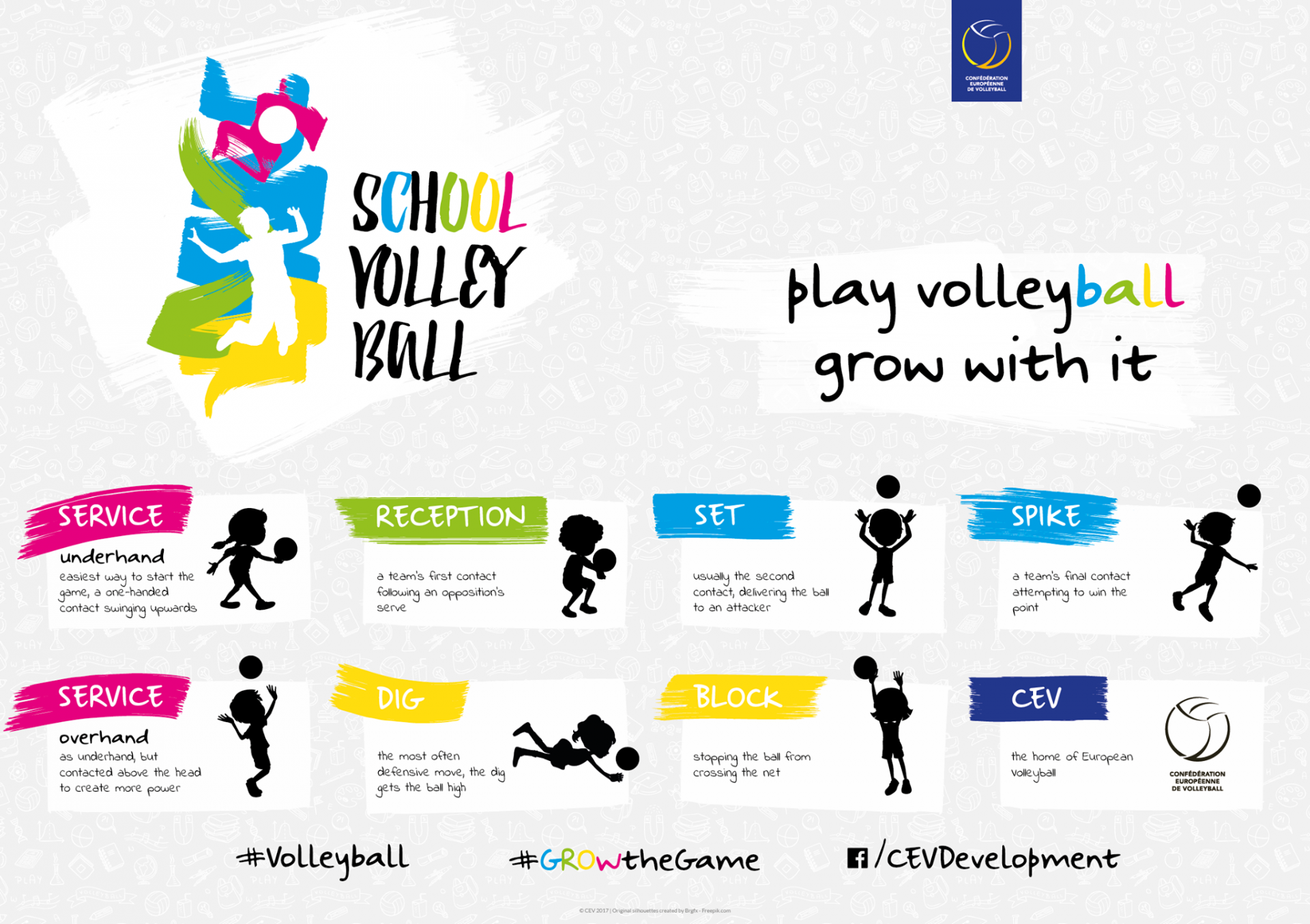 Odbojkarska zveza Slovenije v okviru projekta CEV School Volleyball že od leta 2018 tesno sodeluje z Evropsko odbojkarsko konfederacijo (CEV).  V sklopu projekta potekajo tudi brezplačna spletna izobraževanja v obliki webinarjev, namenjena vsem trenerjem mladih. Priznani predavatelji so se doslej dotaknili različnih oblik dela z mladimi, sestave treningov, motivacije in psihologije.